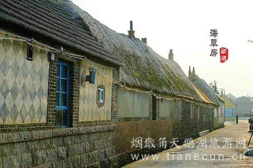 位于荣成市成山卫镇的烟墩角是一个美丽的小渔村,这里因每年11月份至来年的3月份有大批的天鹅前来越冬而闻名。全国各地的摄影爱好者都会在这个季节前来这里拍摄美丽的天鹅,当地的居民便把家中的民居腾出来招待这些摄影爱好者。摄影人既拍天鹅又拍这些记载历史的海草房,使海草房很快传遍全国。但是由于现在海里已经没有海草,以后人们要想看到这些海草房只能是在电视、照片里看了。